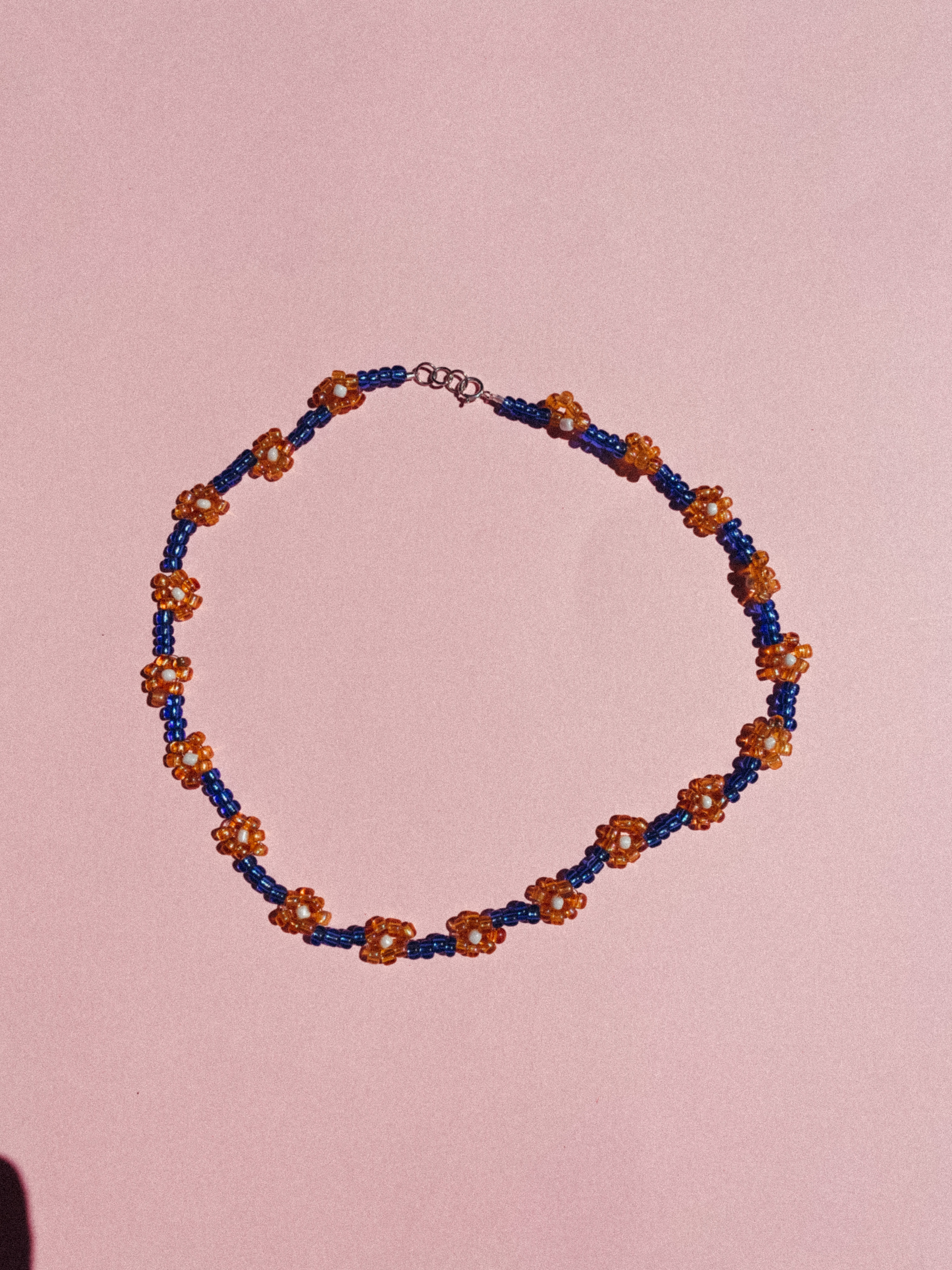 The 'daisy chain' necklace is designed to sit just above the collarbone and has 3 adjustable rings. All of our necklaces are 100% made using deadstock vintage &/or reused beads with sterling silver clasps. Hand crafted in Mt Maunganui close to the ocean.