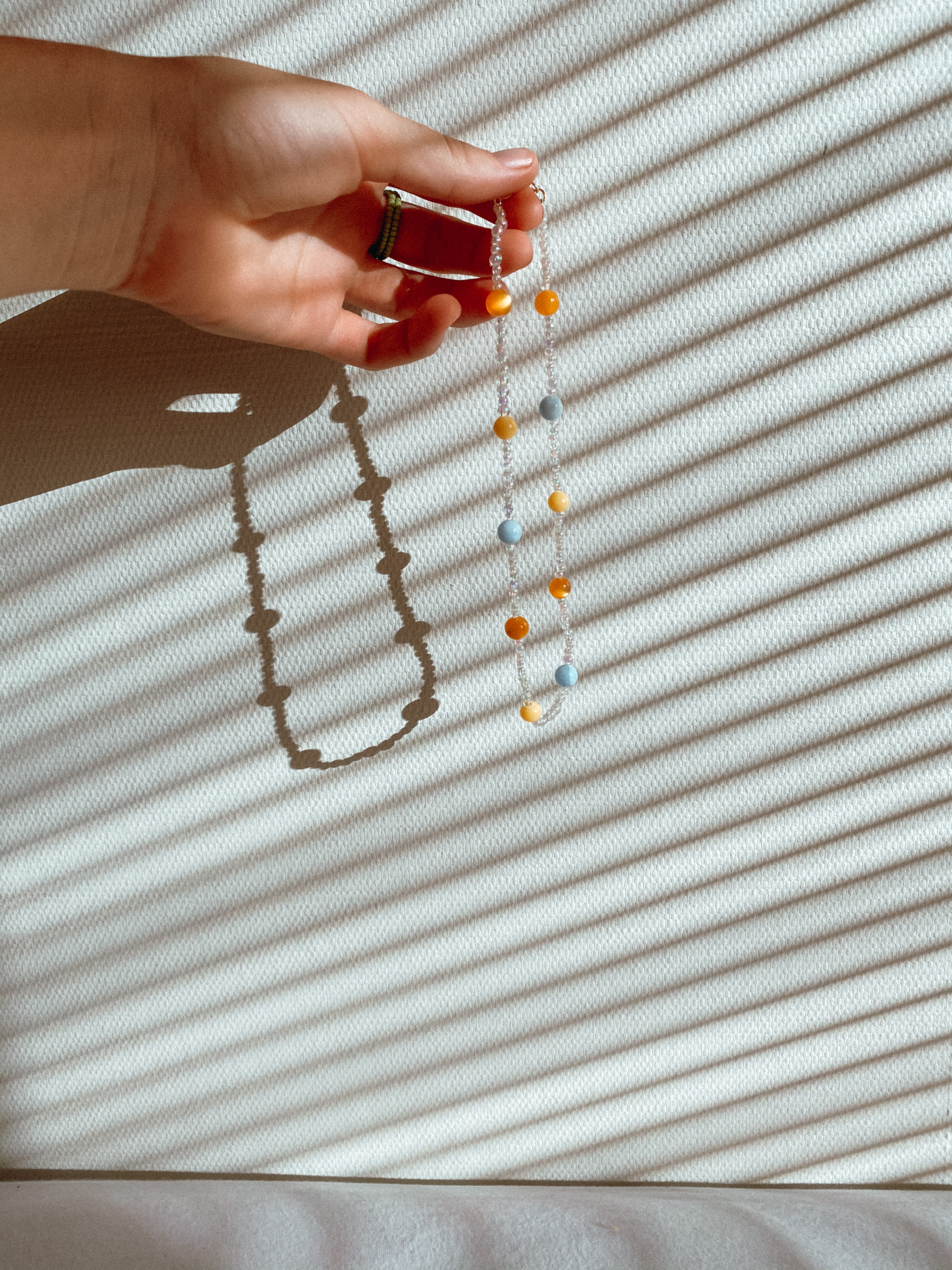 The one off 'Juniper Glow' necklace is designed to sit just above the collarbone and has 3 adjustable rings. Made from 100% recycled beads and hand thread in Mount Maunganui . We also try to use recycled fixtures so if clasps seems mismatched or tarnished just think of the fun life it has lived and the small step you are making to help mother earth.